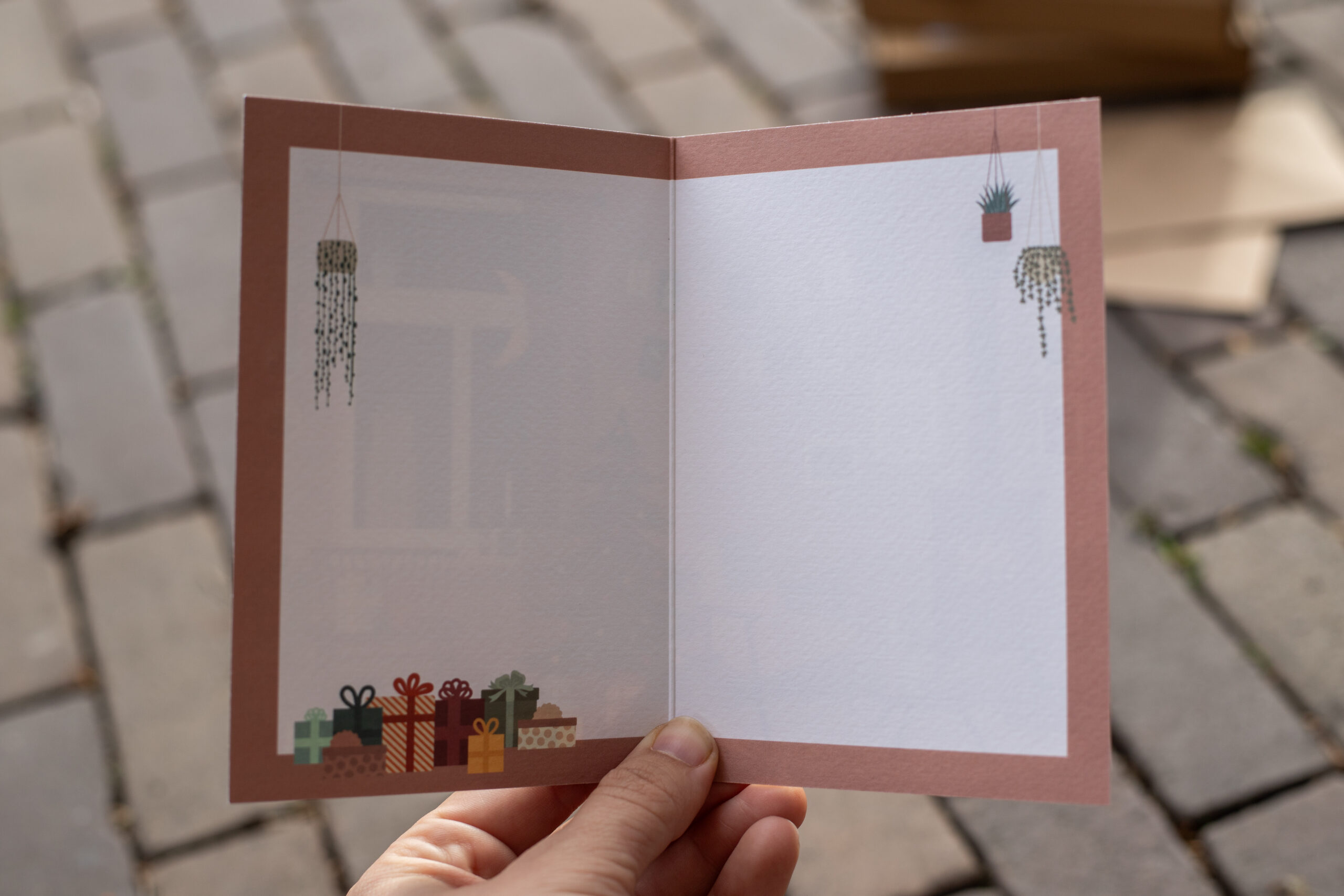 In het setje zitten 8 kaarten, 2 van elk van de 4 ontwerpen + kraft enveloppen. Verpakt in een net doosje.